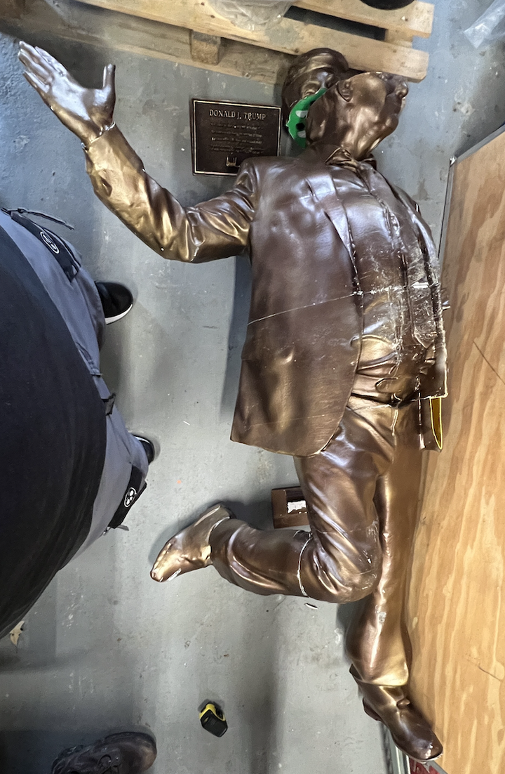 “Requirements of the permit state that it has to be 6 foot by 3.5 foot and this is 9 foot by — and larger than that. So we’re out of compliance here,” the official says within the video. The allow issued to Secret Handshake describes the statue as 6′ by 3.5′. The group described the statue as 12 ft tall when it first went up.